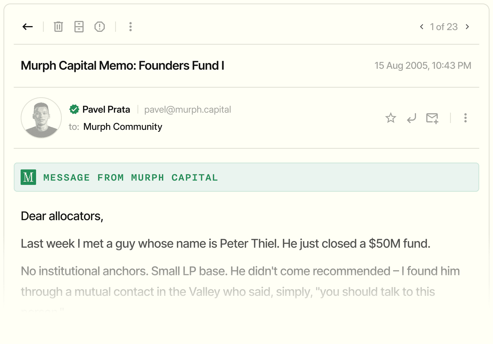 This is not a traditional syndicate. Through the strength of the Murph brand and ecosystem, we organically attract and evaluate emerging VC funds, and share concise memos with our LP network through a free monthly newsletter.